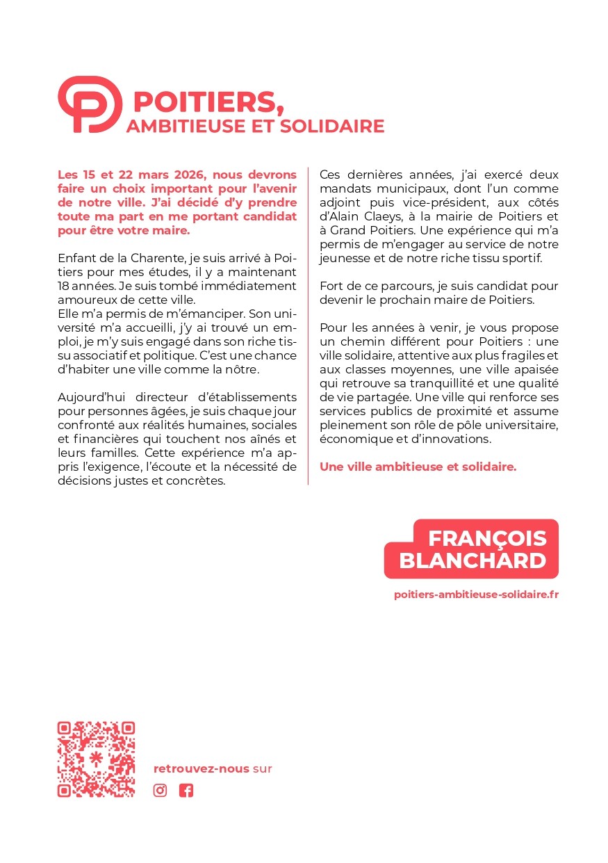François Blanchard a trouvé dans Poitiers les clés de son émancipation par ses engagements citoyens et professionnels. Son implication au service de notre territoire, il souhaite le poursuivre et rendre à notre ville ce qu'elle lui a donné.